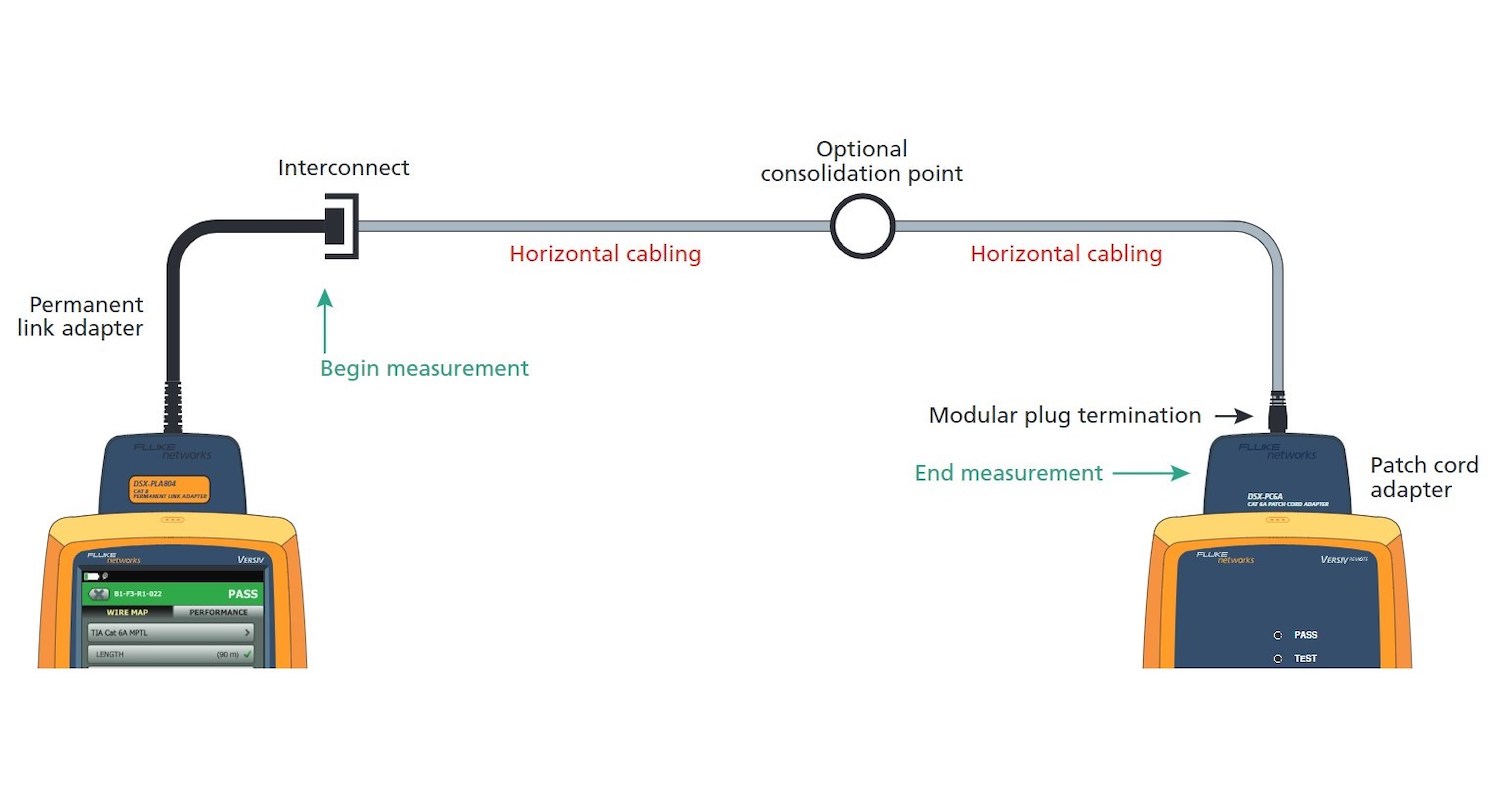 若要取得「MPTL」的LinkWare™報告,您必須使用DSX CableAnalyze系列測試儀器來執行測試,一端使用永久鏈路適配器 (Permanent Link Adapter , PLA),另一端使用短跳線適配器 (Patch Cord Adapter, PCA)。