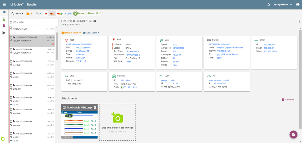 –在資產管理的部份,可以將已安裝設備的序號,及/或纜線/牆壁插座的標籤和特定測試對應,甚至可以附加現場照片、使用者評論附加到測試結果中,為日後變更和故障排除留下參考記錄。