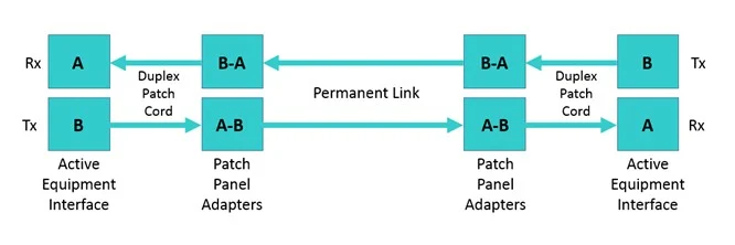 為了幫助使用者選擇和安裝正確的組件以保持正確的極性,TIA-568-C標準建議雙工跳線採用AB極性方案。AB雙工跳線是一種直通連接,可在雙工通道中保持AB極性。同樣重要的是要注意,每個光纖連接器都有一個卡扣,可讓接頭與連接器連接時防止旋轉並保持正確的極性(Tx對Rx)。